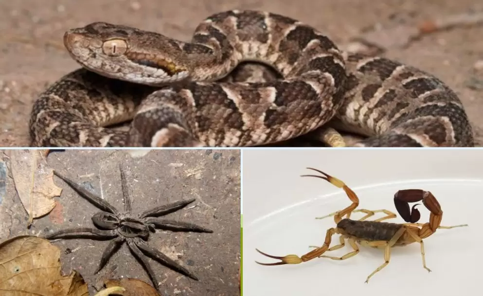 En la región, una de las especies más frecuentes es la víbora de la cruz o yarará. También se destacan dos tipos de arañas peligrosas: la viuda negra, cuyo veneno es neurotóxico y provoca dolor intenso, y la araña del rincón, que genera lesiones cutáneas visibles como ampollas que evolucionan en manchas blanquecinas.