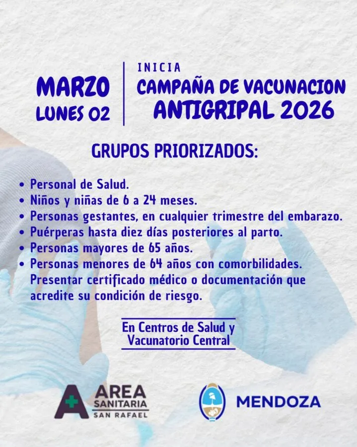 El Ministerio de Salud de Mendoza pondrá en marcha el próximo lunes 2 de marzo la campaña de vacunación antigripal 2026 en todo el territorio provincial, con el objetivo de proteger a los grupos de riesgo antes del período de mayor circulación del virus.