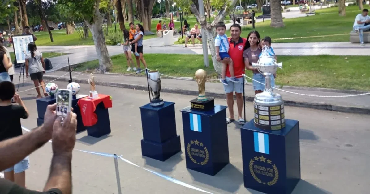 En la nueva peatonal del distrito, inaugurada la semana pasada, llegaron las reproducciones de los trofeos ganados por la Scaloneta y también del trofeo más importante a nivel clubes del continente americano.