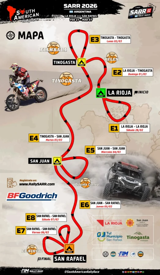 La competencia, considerada por muchos como el “Dakar sudamericano”, atravesará distintos terrenos y geografías del país, combinando tramos de enlace y especiales cronometrados que incluyen dunas, serranías, salinas, ríos secos, caminos rurales y sectores de navegación extrema. En ese recorrido, San Rafael tendrá un rol central al albergar dos etapas completas, además del vivac oficial.